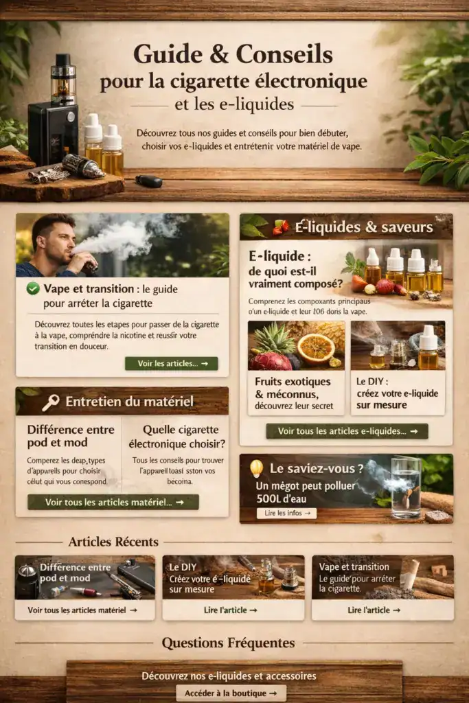 Que vous soyez débutant ou vapoteur expérimenté, notre espace Guides & Conseils est là pour vous accompagner à chaque étape. Retrouvez régulièrement de nouveaux articles pour mieux comprendre la cigarette électronique, découvrir des saveurs originales et profiter pleinement de votre expérience de vape.