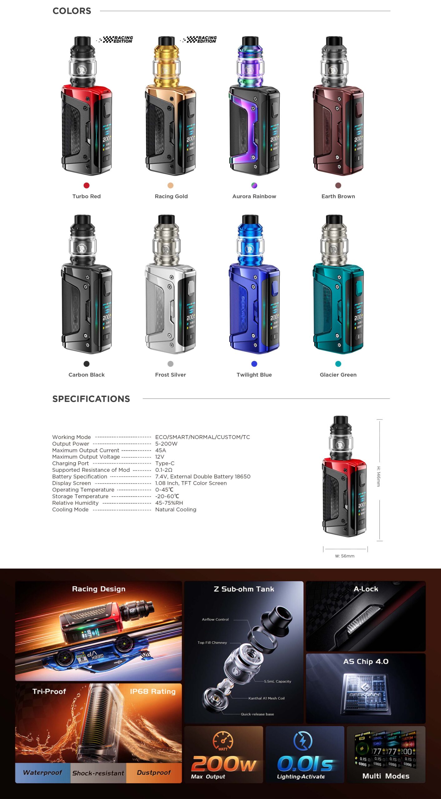 Puissance Brute : Alimentée par deux accus 18650 (non inclus), la box Aegis Legend 5 délivre une puissance maximale de 200W.